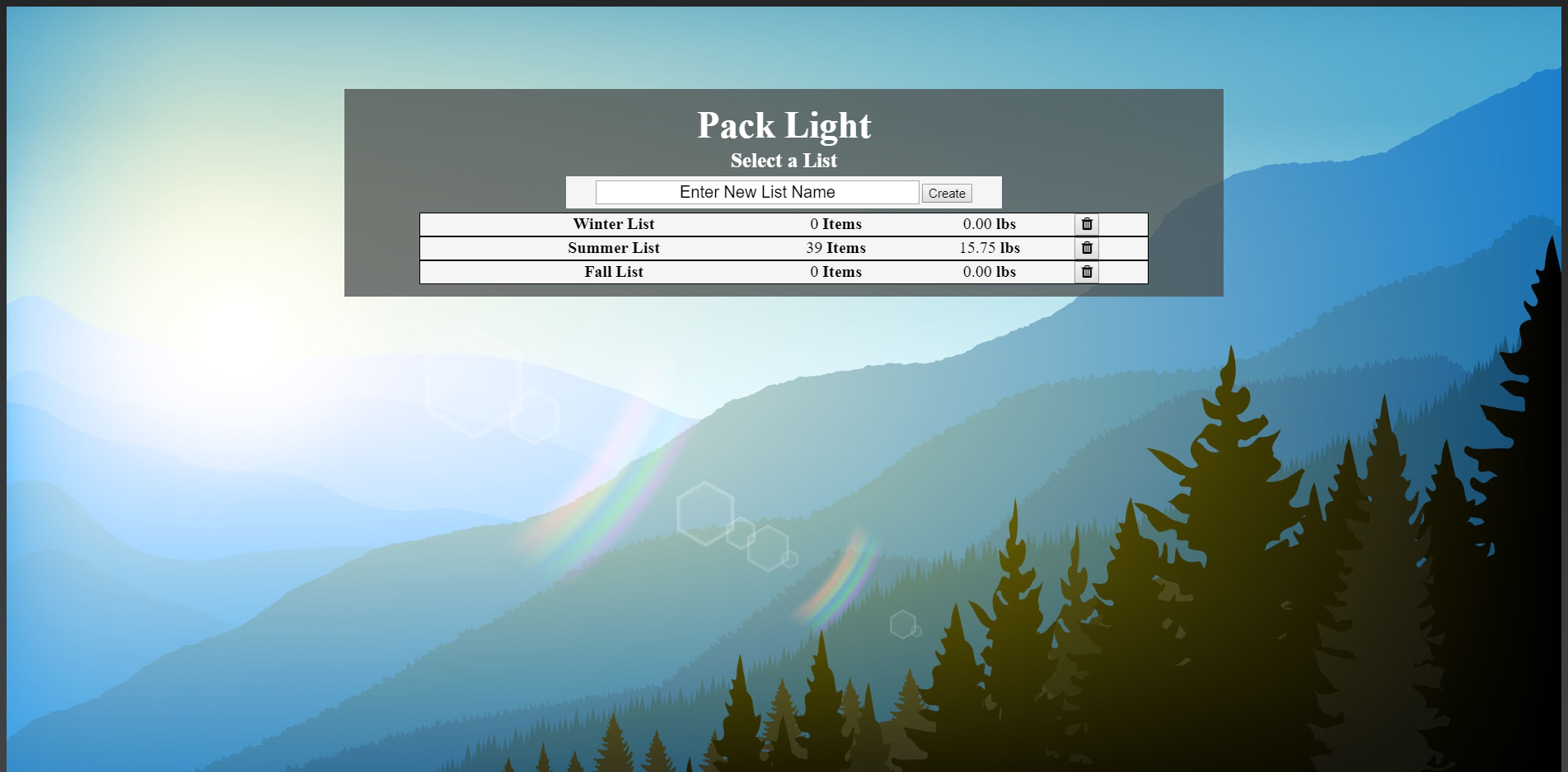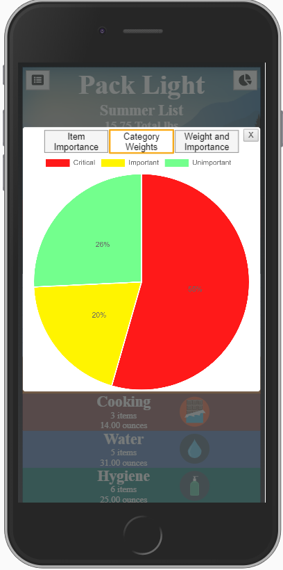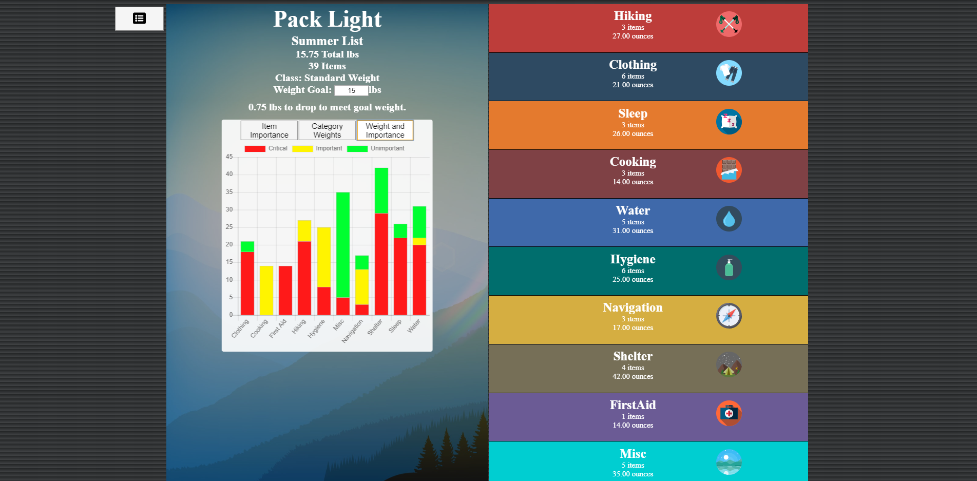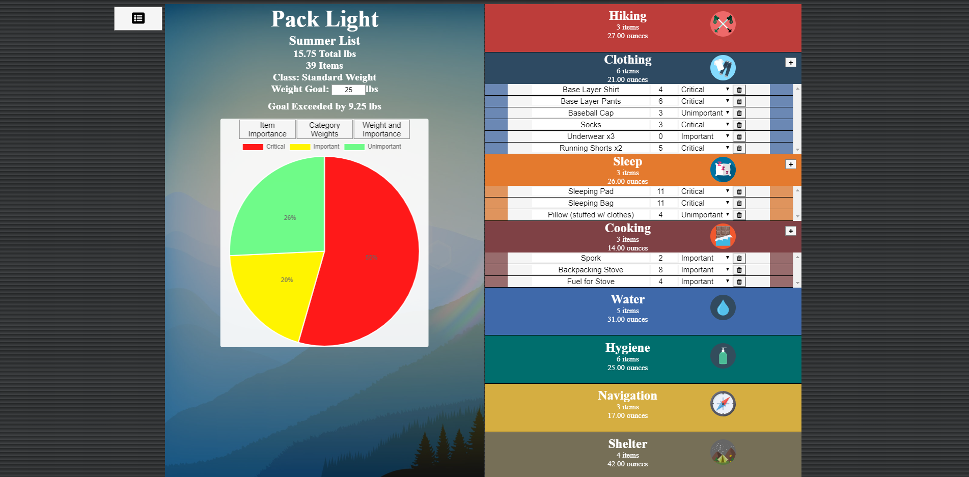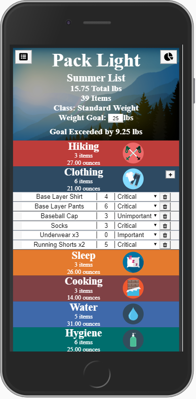 I built this app to help ultralight backpackers keep track of their base pack weight and make decisions about what gear to bring. In ultralight backpacking a few ounces is a big deal so I also added in pack stats and charts to help users visualize their pack's makeup. Users can also save different packing lists to their accounts.